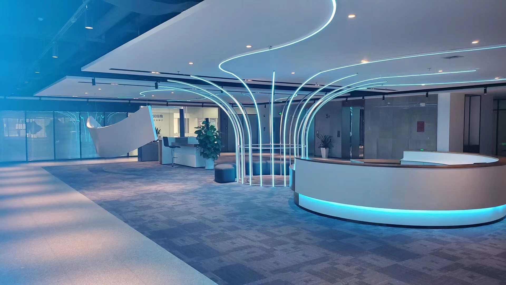 我看了這個展廳,其實并不多,100多平米,中間做了隔斷,整體色彩比較素,白色為主,負責綠色點綴,環境光用的中光,燈帶用的科技藍LED燈帶,天花做了點造型,地面貼了地貼分色,展廳做了拼接屏及一體機,做了中控,設備及燈光用ipad控制,還有2個投影機,做了一個弧幕投影,每個板塊做的比較分明,無非就是小造型加燈箱,立體字。整體風格簡潔大氣,看起來非常干凈,展示板塊分明,加上有中控帶來一點科技感,所以客戶非常喜歡。其實這種做法是我們現在做數字展廳設計的普遍做法,可能客戶看的比較少。